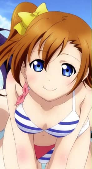 実際上の人間と比較するに、なぜこんなに目が大きいことが不自然に見えず、むしろ「かわいい」と思えるのか、全くもって謎なのですが、とにかく「高坂穂乃果」の超アップの「水着姿」という、「レア感」のある肢体を見ることができるだけで満足なのです!