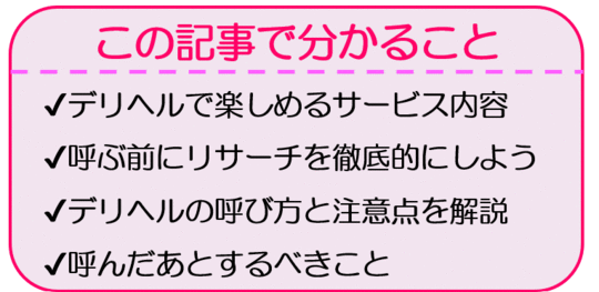デリヘルはデリバリーヘルスの略で、文字通りホテルや自宅に女の子を呼び本番行為までの性的サービスをしてもらいます。