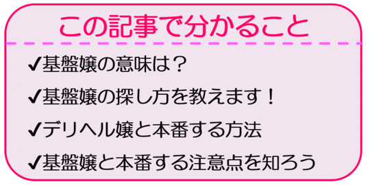 みなさんは、”基盤嬢”という言葉を知っていますか?風俗店の口コミなどを調べていると、たまに見かけることがある言葉だと思います。『基盤嬢=本番できる』という考えになりますが、そんな基盤嬢の見つけ方や本番までの誘い方、注意点などを紹介していきましょう!