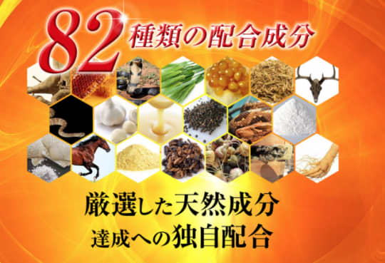 ニンニク抽出物、有機プロポリス抽出物、ザクロポリフェノール、トンカットアリ濃縮物、黒胡椒 抽出物、マカ、難消化性デキストリン、明日葉、大麦若葉、ガジュツ、甘草、キクイモ、きくらげ、 金時ショウガ、クコの実、クマザサ、ザクロ、アルファルファ、山査子、モロヘイヤ、ヤーコン、 羅漢果、黒豆、紫シソ葉、根昆布、アガリクス、鳥霊参、カイアポ、カバノアナ茸、カムカム、キ ダチアロエ(葉)、キャッツクロー、黒ウコン、杜仲葉、マキベリー、紫イペ、メシマコブ、グァバ葉、 ヤマブシダケ、霊芝、カツアバ抽出物、ノコギリヤシ、ムイラプアマ抽出物(樹皮)、ヒバマタ、ボロホ、 ブラックジンジャー、トンカットアリ抽出物、高麗人参、紅景天、田七人参、ハト麦