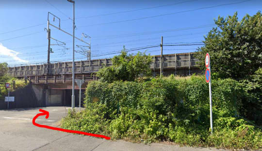 次は、高架線をくぐり直進します。