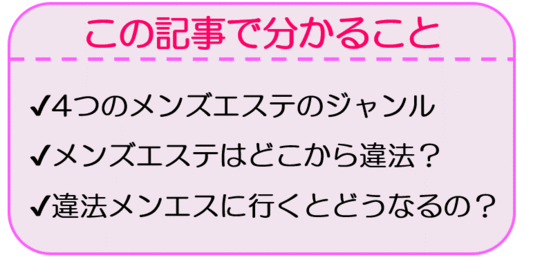 ※美容目的のメンズエステは明らかに違法では無いため、ここでは割愛します。