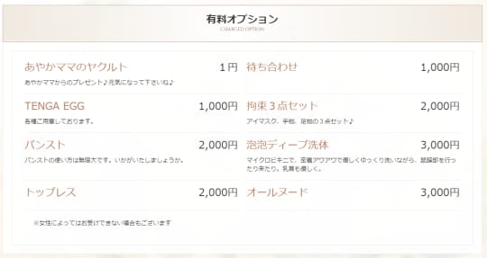 等サービス系のオプションがあります。自分好みのオプションを付けて好みのプレイをしてもらうことが出来ます!