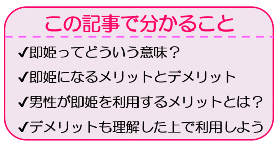 言葉は知っていてもよく分からなくて踏み出せてなかったという人は、即姫にどんなメリットがあるのかを知ることから始めるといいでしょう。