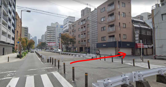 次は、このようにポールが立っているところを右へ曲がり、路地に入りますよ!