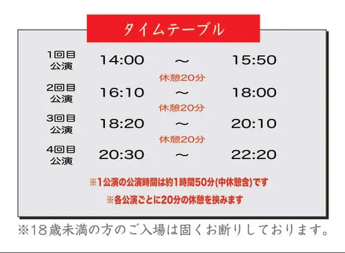 1日に公演が4公演ありますが、一度料金を支払えば1日に何度も観劇することが出来ます。
