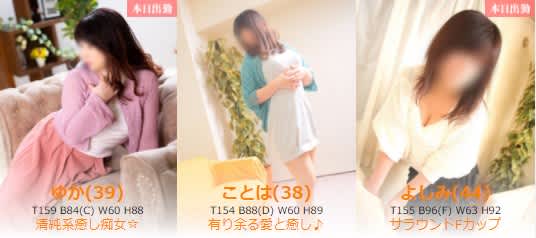 癒しとエロさを求めるなら癒し妻で決まりですね。こちらには幅広いタイプの人妻が在籍しています。さらに待ち合わせと即尺が無料という部分も嬉しいですよね。人妻デリヘル未経験者にもオススメします。