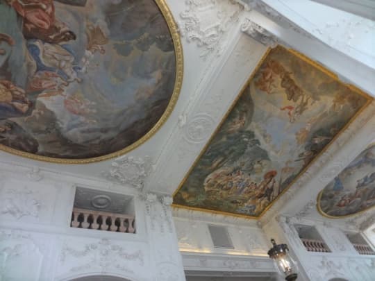 外観は重厚感がありそれほど派手ではありません。しかし内部は非常にきらびやかで、白を基調とした美しいエントランスや、いくつものシャンデリアがある大広間、息をのむほど壮麗な天井画など、見ごたえは抜群。城内は必ず見学した方がいいでしょう。
