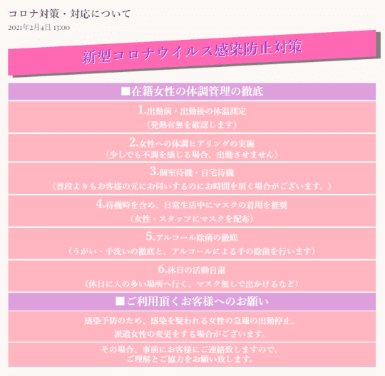 また、対面した際も検温やアルコール消毒をお客様にお願いをしており、嬢を守るためにも徹底されています。