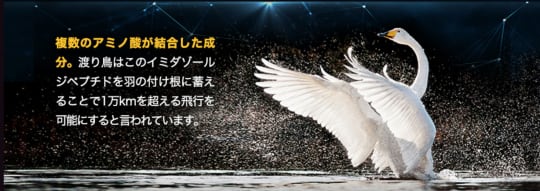 渡り鳥はイミダゾールジペプチドを羽の付け根に大量に蓄えることによって、大陸を1万キロをも飛行することを可能にしているんだとか。