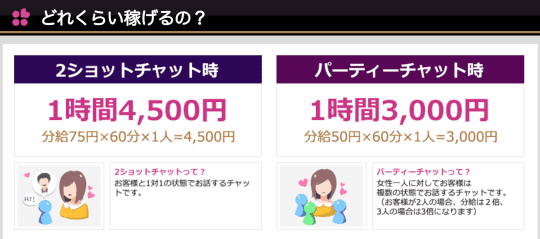一見2SHOTチャットの方が手っ取り早く稼げるように見えますが、パーティチャットは「男性一名につき」の報酬!