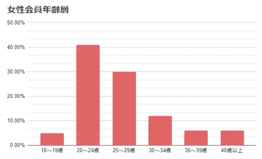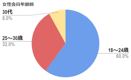 女性会員の年齢層は上記画像の通り、18~24歳の子が圧倒的に多いです。