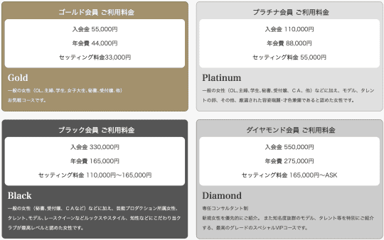 男性に会員ランクがあるのと同様に、女性にも会員ランクが存在します。面談を経て女性はそのルックスやスタイル・内面的人の良さなど、評価基準を元にランク分けされています。
