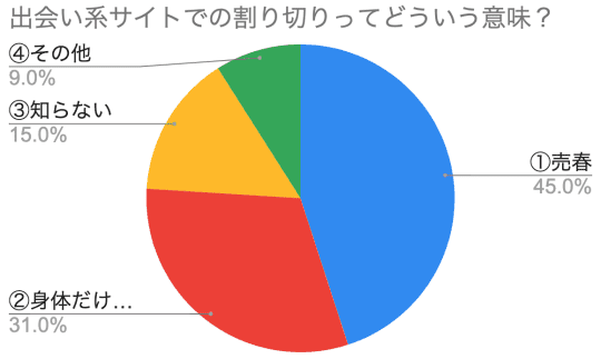 「①売春」とはっきりと知っているということは、出会い系サイトを使用したことがある男性だということでしょう。