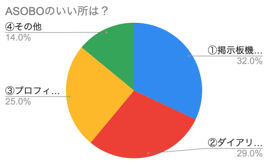 「①掲示板機能が充実している」は、ASOBOは確かに掲示板の充実度が高く、出会いに繋がるというところがありそうです。