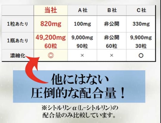 シトルリンαを摂取できる精力剤はたくさんありますが、他社は1瓶あたり10,000g未満が多いため、ANTBOMの配合量を比べ物になりません。