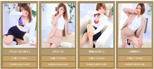 24歳~35歳まで30名以上在籍。そのほとんどは28歳前後…超スレンダー巨乳が多いのがポイントです。