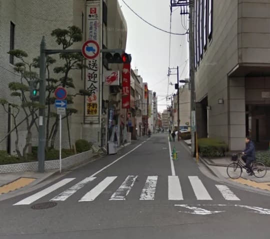 駅前の横断歩道を渡ると、カニ関連のお店の看板が見えるので、その路地を直進します。