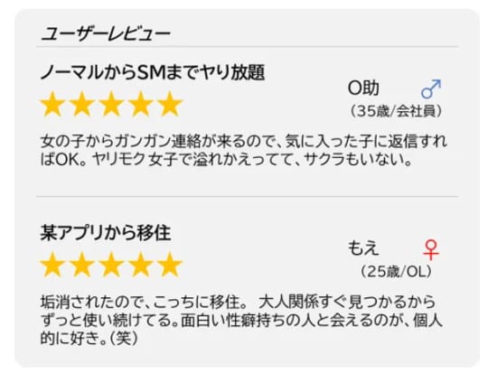 掲示板では老舗出会い系サイトだからこそ、ヤリモク女子の定番サイトとなっています。特に若い世代の利用が集中しているので、開放的なノリの良い女性が多数登録!