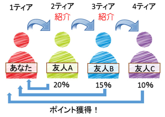 要はあなたが「親」となって、A~Cの「子~ひ孫」までの獲得したポイントが還元される仕組みです。