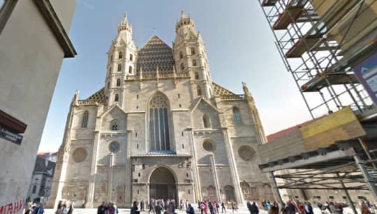 高くそびえる尖塔と、美しくも不思議な模様の屋根が特徴的です。塔には登ることもでき、頂上からは屋根のモザイク模様やウィーンの街並みを眺めることができますよ。