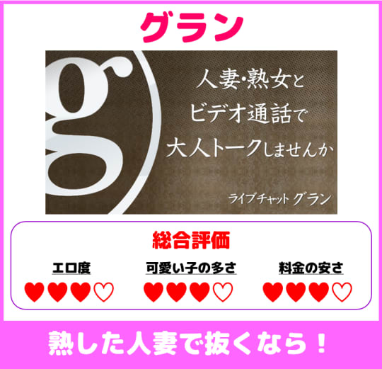 GRAN | 30代~50代 | ・音声通話:22pt(220円)/分 ・ビデオ通話の料金:26pt(260円)/分 | ★★★★★ | ★★★★☆ |