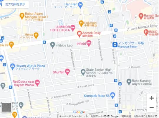 場所はジャカルタ市内を走っている「12K・JAK.10」番のいずれかのバスに乗車し、最寄バス停留所である「Jalan Manggis」を下車すると歩いて迎える距離に有ります。