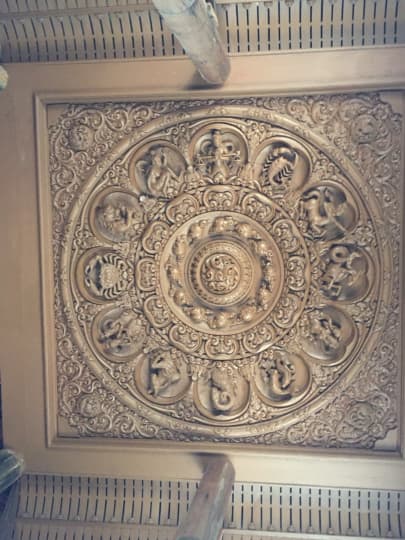 これは何の写真だと思われますか?正解は天井です。どのようにはめ込まれているのでしょう。 素晴らしさと不思議さで、上をてじっと見上げていたので、首が痛くなりました。 園内にタイマッサージが有るのはこの為でしょうか?笑