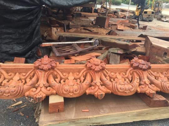 寺院の裏には工房が有り、そこには木材や、現在、彫刻中の作品が置かれています。 この途中経過を見るのもサンクチュアリを知る上で興味深い物が有りますね。