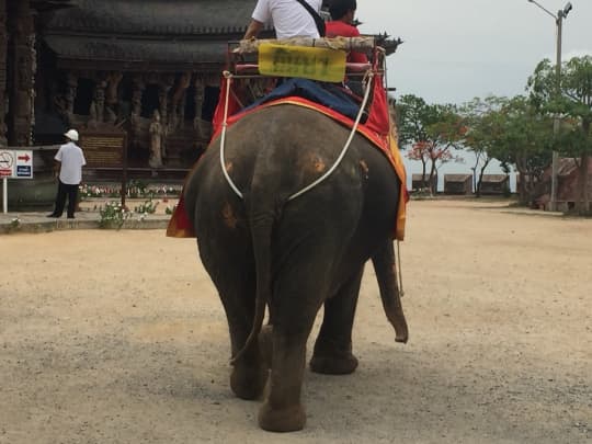 サンクチュアリの直ぐ手前には象の乗り場が有ります。タイの乗り物?と言えばやはり象でしょう。大きな象は近くで見ると凄い迫力ですが、とてもおとなしく優しい目をしています。 約30分程の遊覧?で400バーツ日本円で約1400円です。