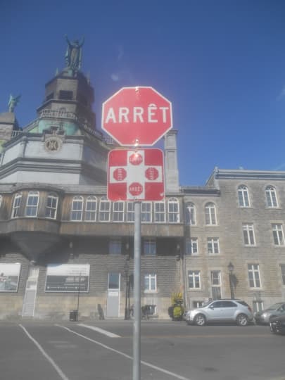 街中の建造物だけでなく、言語もまるでフランス感を出していますよね。初めてモントリオールに行ったときにレンタカーで旅行したため、標識が読めずに慌てましたが、標識の形はアメリカと同じであったことと、事前に英語とフランス語が併用の標識を何度か見ていたので、運転はなんとかなりました。例えば写真のように8角形で赤色はストップなので、フランス語でストップという意味だと予想できます。
