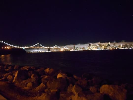 もう一つのおすすめはトレジャーアイランドという島から、湾を挟んで眺められます。ここならベイブリッジ(サンフランシスコ・オークランド・ベイブリッジ)のイルミネーションも同時に見えました。こちらは市バスでもアクセスできますが、バス停や周辺の治安が心配でした。ツアーかレンタカーで行くことをおすすめします。