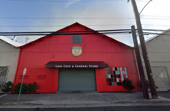 外観はライオンコーヒーらしい赤色の建物で、入口にはライオンコーヒーのライオンマークが設置されています。