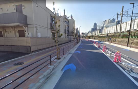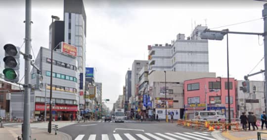 駅を後ろに大久保通りの十字路を右へ曲がります。