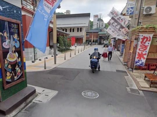 このあたりまで来たら、もうすっかり温泉街の雰囲気です。道後温泉別館・飛鳥の湯、飛鳥のれんのところまで来たら右折します。