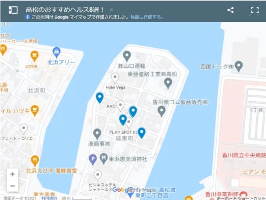 高松の風俗街は「城東町」というところに集まっています。その中でも城東町2丁目にはソープ、箱ヘルが多いです。なお、デリヘルは位置を表示していません。