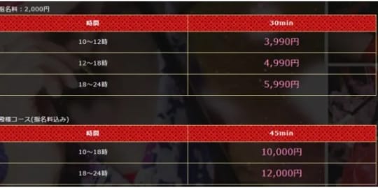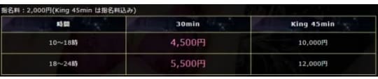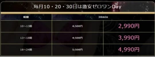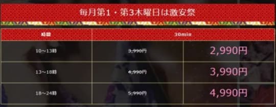 料金 | 30分・3,000円~・第1・第3木曜の激安祭価格 | 30分・3,000円~ |