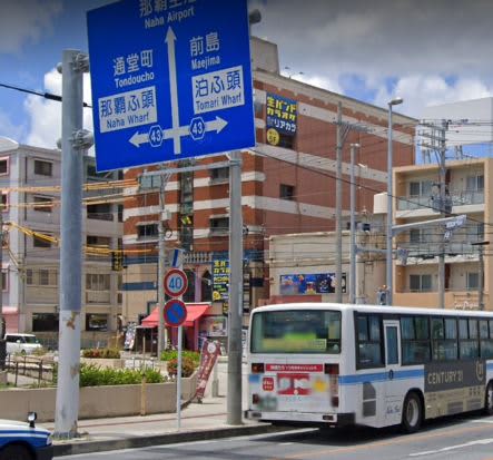 左側に福州園を見ながら直進して、若狭大通り(43号線)を那覇ふ頭方向へ左折します。