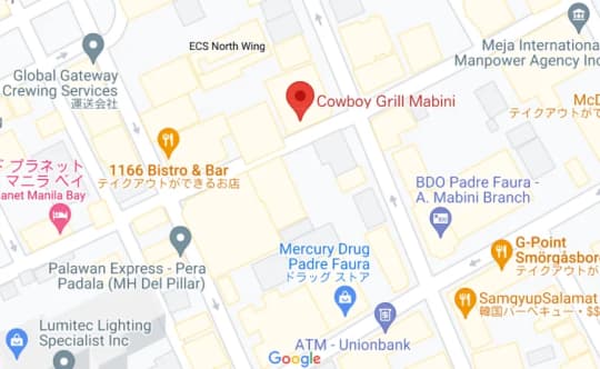 なおこのカラ置屋はグーグルマップに印がありませんので、隣の有名な「カウボーイ・グリル・マビニ」の地図を貼っておきます。