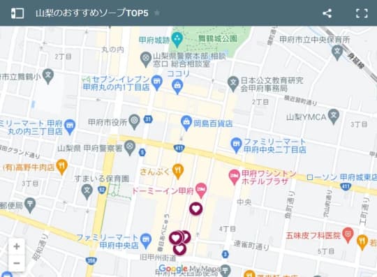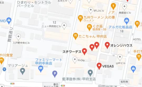 中でもソープランドが密集しているのは、甲府駅周辺の中央1丁目です。