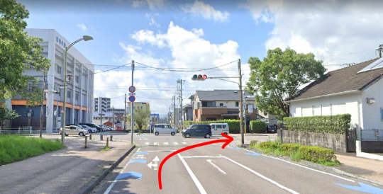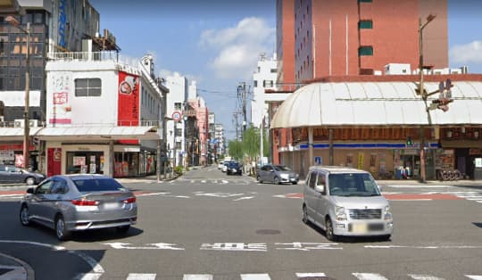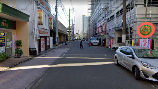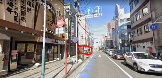 まず、駅を出て、目の前の「保健所通り」を右に直進してください。