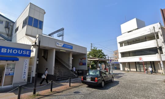 駅を背に左(画像奥)に進み、画像右側に見える「白いビル」を右側に曲がってください。