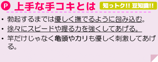 手を上下に動かすだけでなく、フルート舐めの最中に亀頭を手のひらで包むようにして刺激するなど、かなりバリエーションが増えますよ!