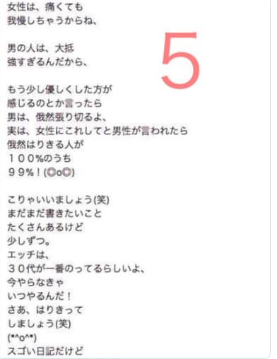 それは挿入までの4日間を性器以外の愛撫で費やし、5日目に挿入した時には、すぐにイッてしまい、その快感が長続きするのだそう。