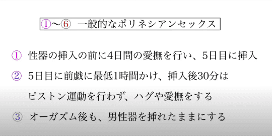 ポリネシアンセックスとは、そんな軽いものではなく、ポリネシアで伝統的に行われてきた性行為で、愛撫から挿入までを5日かけます。