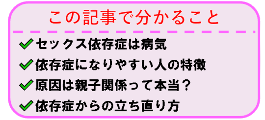 愛情が足りなかったことから恋人に依存をし、それがセックス依存症にも繋がっていると言われています。
