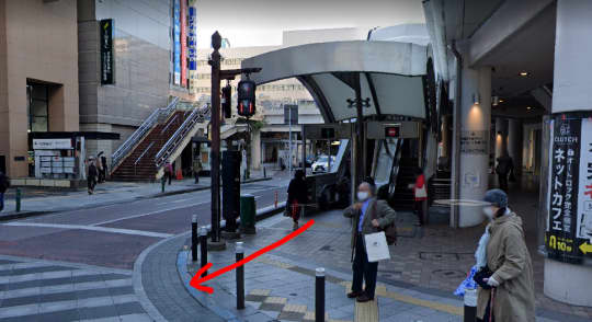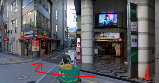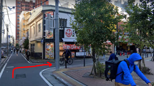 右側にマクドナルドがありますね。手前右側に斜めに伸びる細い道(レイソルロード)を曲がり直進です。