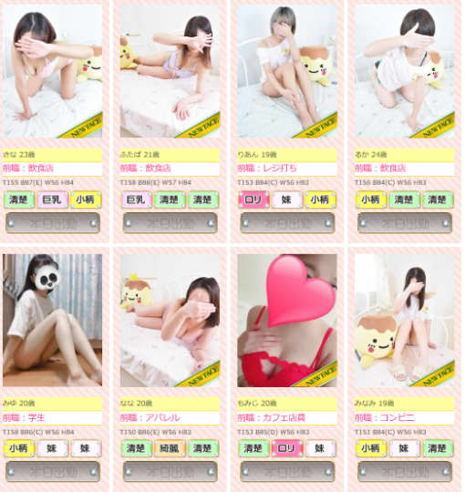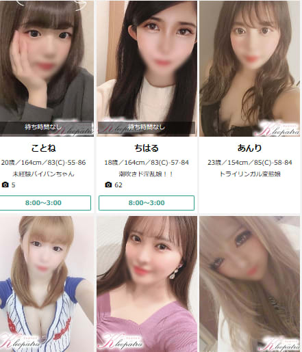 料金 | 20分3,500円~ | 20分4,000円~ | 60分17,000円~ | 45分12、000円〜 | 50分12,000円〜 | 40分11,000円〜 | 60分12,000円〜 | 50分11,000円〜 | 50分10,000円〜 | 60分14,000円〜 | 60分15,000円〜 | 60分15,000円~ | 10:00~24:00 | 70分13,000円~ | 60分10,000円~ | 60分11,000円~ |