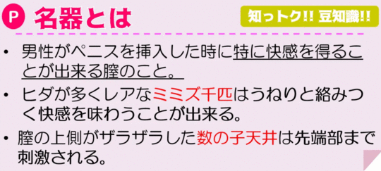 数えきれないミミズがペニスに絡みついて、男性がすごい快感に陥るヒダ系の名器。