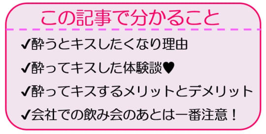 - Q酔っぱらうとなんでキスがしたくなるんですかAお酒というものは気持ちも高めてくれるものです。そのため、いつもより少し勇気が出ちゃったりして、いつもはグイグイいくことができない相手にだって、積極的に行動を起こすことができるようになるからです。